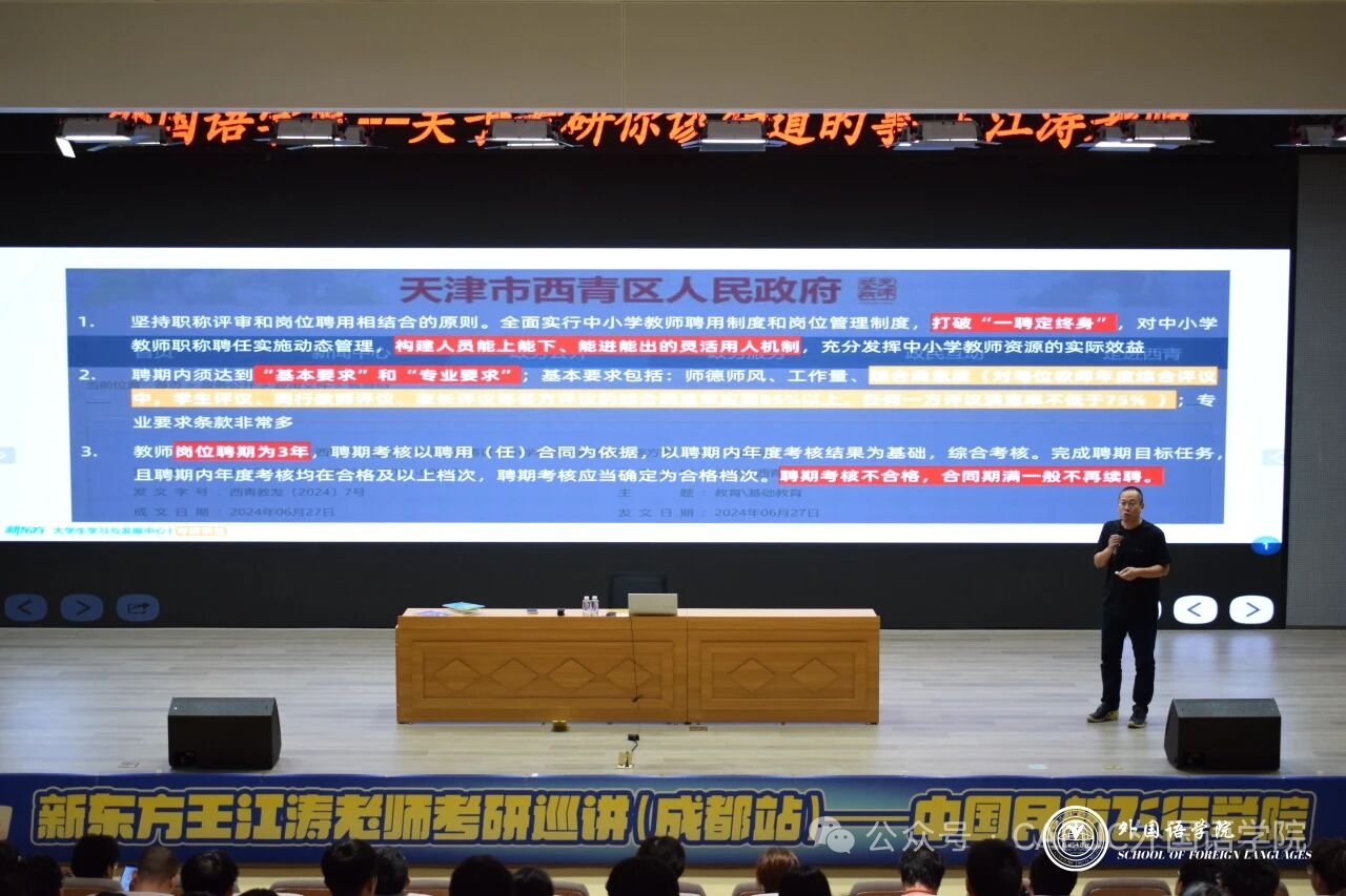 本网讯 宝盈bbin直营平台报道:为帮助学子打破考研信息壁垒,科学规划升学路径,9月24日晚,扶摇书院·宝盈bbin直营平台一站式社区在图书馆报告厅举办考研指导讲座。讲座由宝盈bbin直营平台副院长申卫华主持,特邀新东方资深考研教师王江涛担任主讲,为同学们带来一场内容详实、指导性强的备考分享。